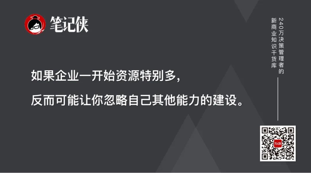 企业的成长也是如此,如果企业一开始资源特别多(比如较多的融资),反而可能让你忽略自己其他能力的建设,比如,团队的磨合程度、信任程度,文化、价值观的一致程度都可能出现问题,能不能活下去、活得很好,都存在很大的疑问。