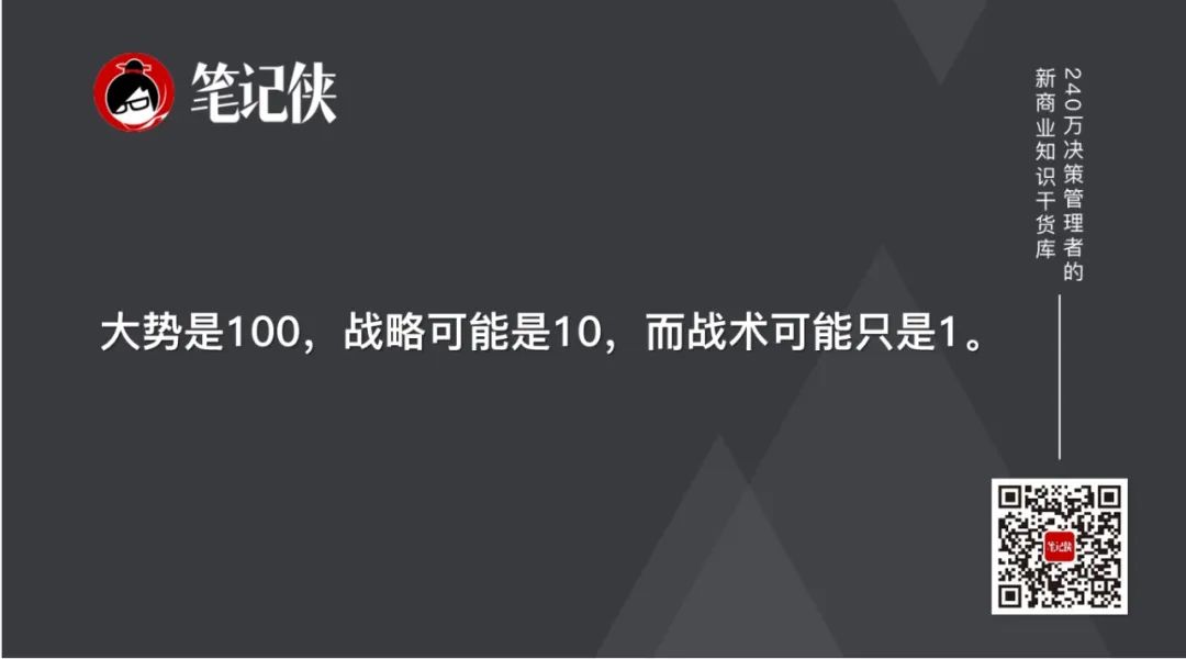 “时势造英雄”,对于创业者来说,拥有判断大势的能力非常重要。如果说大势是100,战略可能是10,而战术可能只是1。