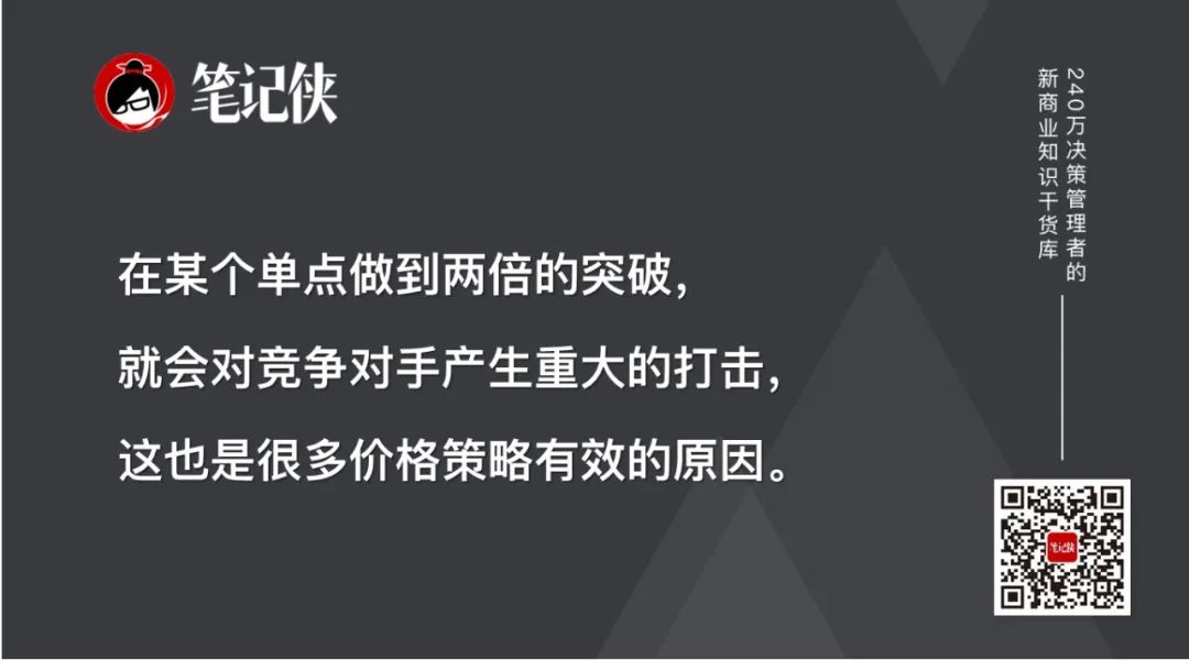 在单点做到两倍的突破,就会对竞争对手产生重大的打击,这也是很多价格策略有效的原因。同样,对时间敏感的用户,如果效率能提高两倍以上,用户有可能愿意为此买单。