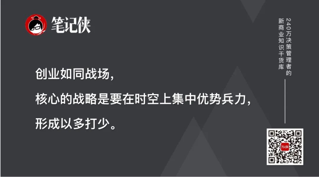 军事家的取胜从来都是以多打少,在局部战斗中保持绝对优势,保证战役的胜利。创业也一样,核心的战略是要在时空上集中优势兵力,形成以多打少。