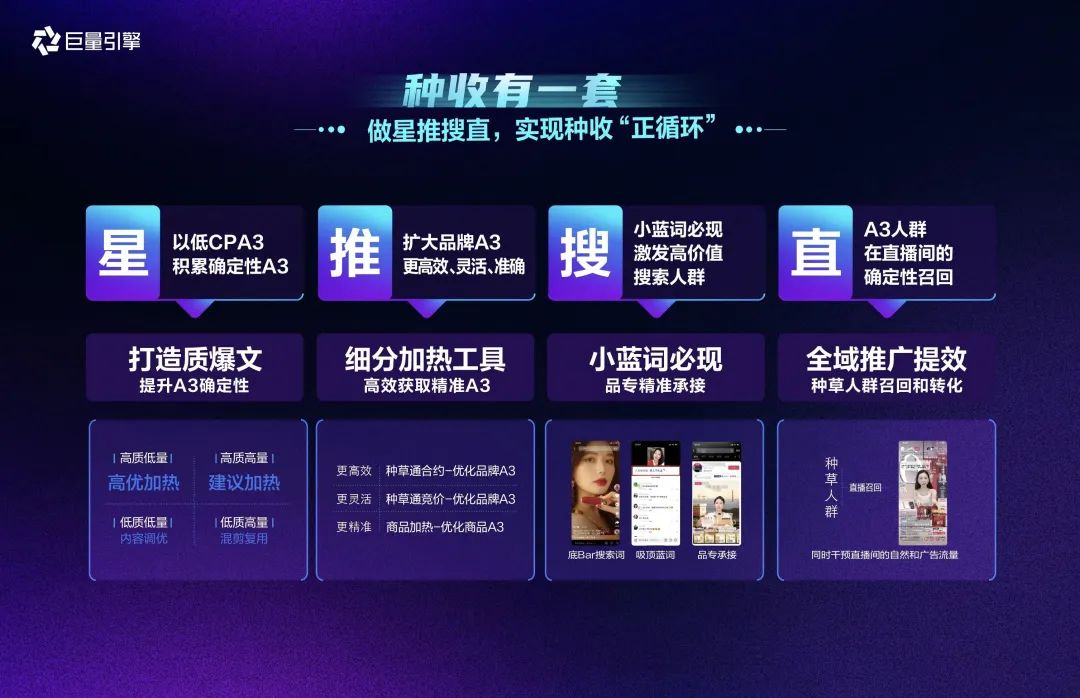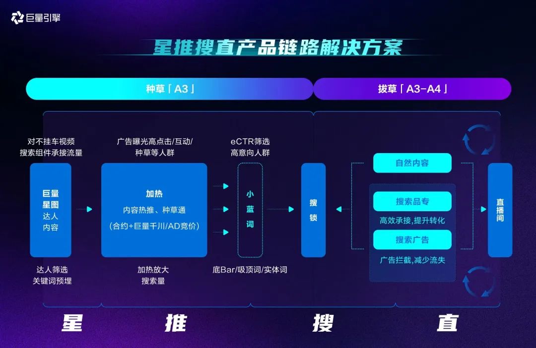 星推搜直以A3人群为轴心,通过星图、热推、搜索、直播,四大产品全新组合,构成了提升种收确定性的营销链路,大大降低种草成本。