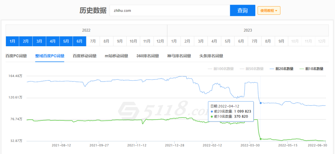如果上面只是知乎机构号运营者的经验判断,那5118显示的数据那就是实锤了。2021年2月2日,在整域百度PC词量中,知乎站点作为前10和前20数量分别是53W+和114W+,而且同年度一直呈现攀升态势。