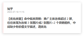 第一种:文章中放了一张用产品绘制的长图,或者是讲解产品使用教程时每个步骤都放了一张对应的说明GIF,结果被判定为低质营销,因为它说推广主体连续超过2屏。我当时真的是黑人问号脸,知+不就是让品牌方合规地打广告吗?