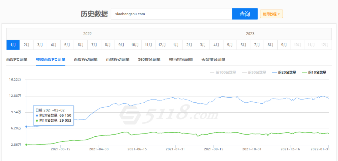 5118数据显示,2021年2月2日,在整域百度PC词量中,小红书站点作为前10和前20数量分别是2.9W+和6.6W+,而后持续攀升。