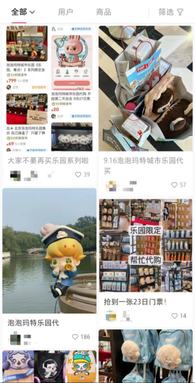 对于原IP的消费者及粉丝来说,乐园形式能够带来更加沉浸的体验,让粉丝更近距离接触到IP形象。小红书上就出现了不少城市乐园代购的身影,主要代购商品为IP系列书包、盲盒等产品。