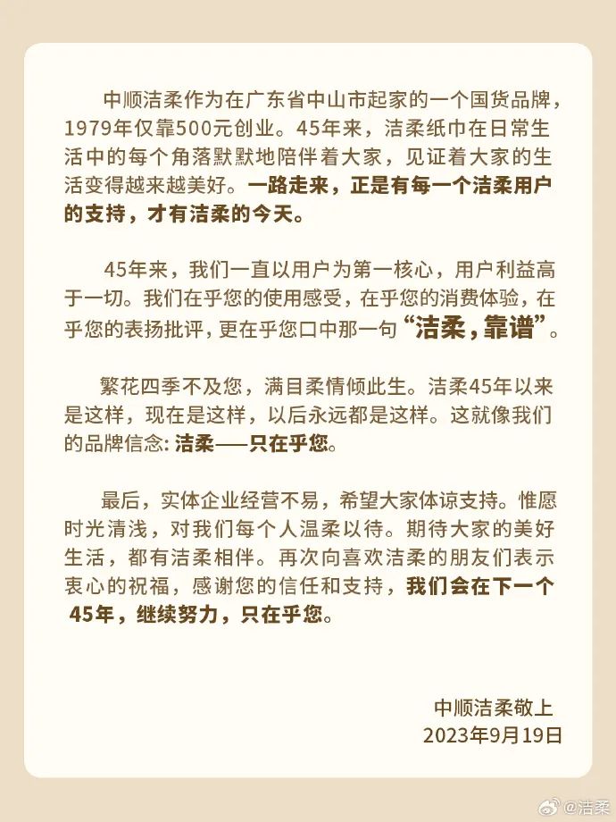 #洁柔写信感谢取消10元6箱订单顾客#,昨天晚上登上热搜第一,全网2.9亿阅读量。