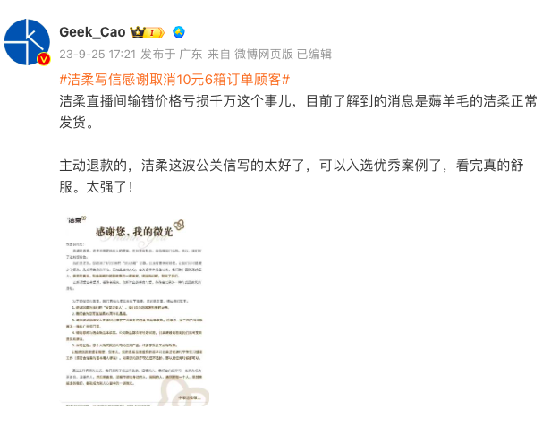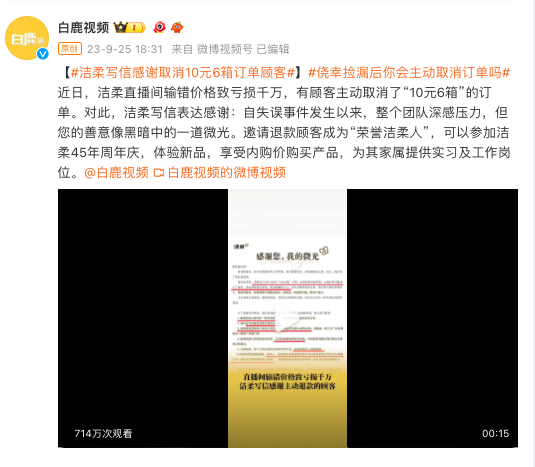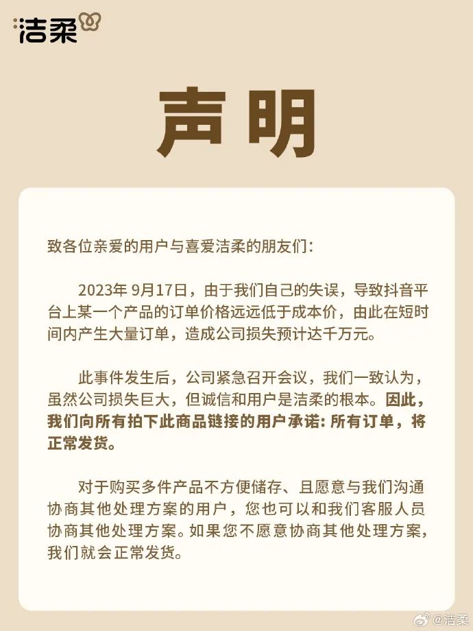 9月17日,洁柔官方抖音直播间因员工操作失误,将原价56.9元1箱的纸巾误设置为了10元6箱,引发大量用户下单抢购,最终成交订单数超过4万单,损失金额超千万元。9月19日11点41分,洁柔官方微博宣布:
