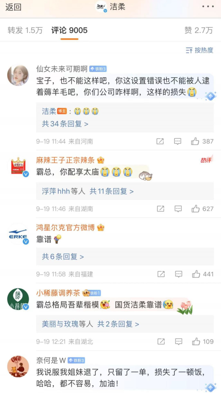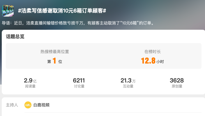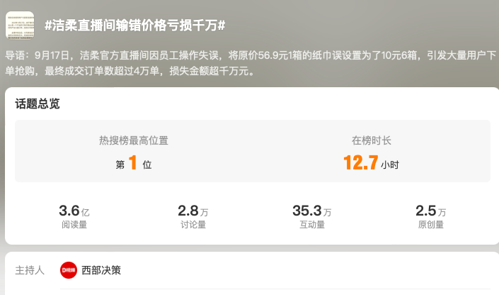 9月19日,#洁柔直播间输错价格亏损千万#登上微博热搜第一,阅读量3.6亿。