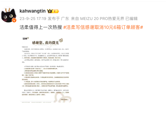 昨天,#洁柔写信感谢取消10元6箱订单顾客#登上热搜第一。