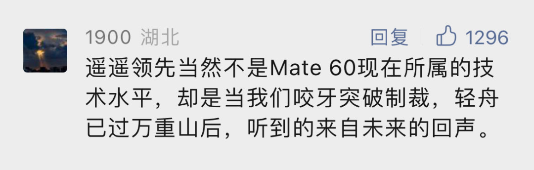 Mate 60是否真的遥遥领先,已经不重要,重要的是其中蕴藏着的一种力量,正如下图网友所言。