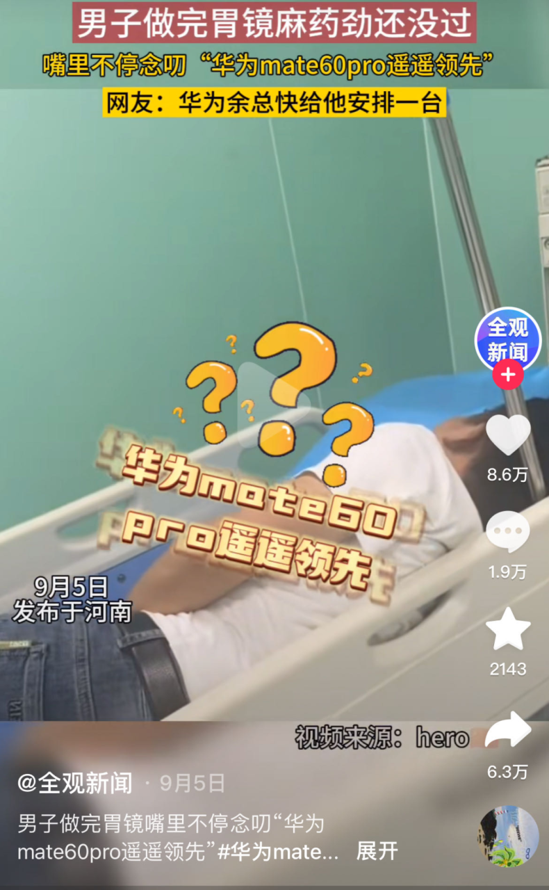 比如有人曾将遥遥领先这个词改成了“遥遥落后”,以增加讽刺或夸张的意味;比如有人用周杰伦的《本草纲目》作为曲,配上余承东的遥遥领先作为词,成为一首鬼畜音乐;比如有报道说一男子做完胃镜手术,昏迷中一直念叨“华为Mate 60 pro,遥遥领先”。