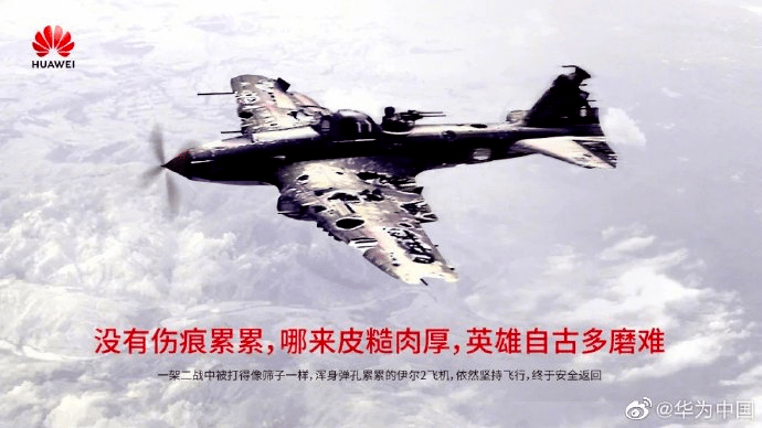 第二天,华为官方“心声社区”5月16日发布了一张,内容是一架飞机遍体鳞伤,但依然在空中飞行,上的文案是:“没有伤痕累累,哪来皮糙肉厚,英雄自古多磨难。”随后,这张同样在朋友圈刷屏。