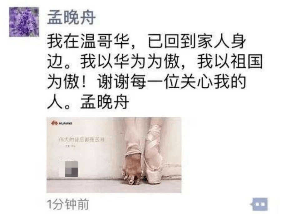 比如,2018年2月11日,被加拿大拘押近10天的华为CFO孟晚舟获得保释,当晚,孟晚舟在朋友圈发布了一张“芭蕾脚”的,,并在“芭蕾脚”上配上了罗曼·罗兰的名言:伟大的背后都是苦难。随后,这张在朋友圈刷屏。
