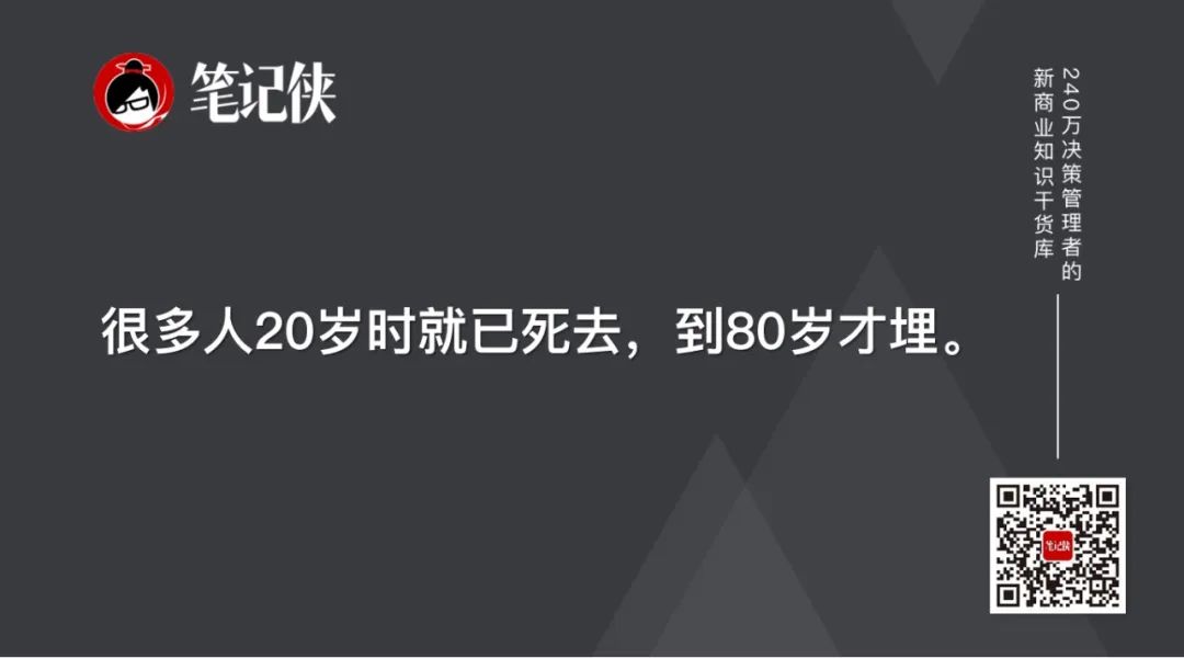 那时,即使生命尚未终结,生命力也已戛然而止,也就印证了那句著名的话“很多人20岁时就已死去,到80岁才埋”。