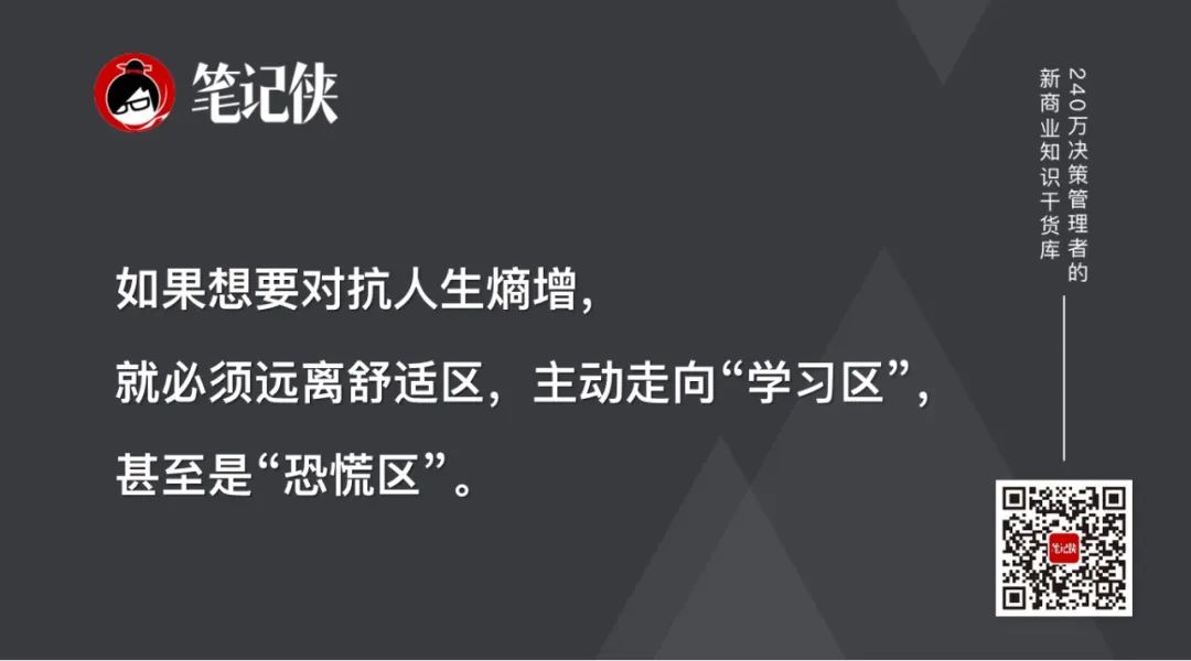 如果想要对抗人生熵增,就必须远离舒适区,主动走向“学习区”,甚至是“恐慌区”。