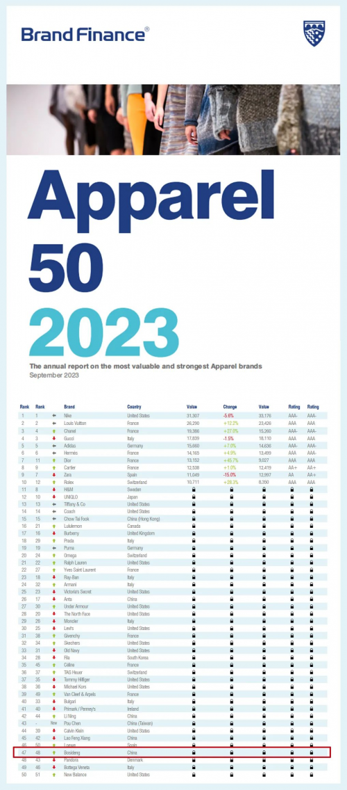 根据国际五大品牌价值评估权威机构之一Brand Finance公布的「2022全球最具价值服饰品牌排行榜50强(Brand Finance Apparel 50 2022)」,波司登品牌再次入选,并提升名次,位列服饰品牌榜第48名,这也是波司登坚持做时代品牌最好的回报。