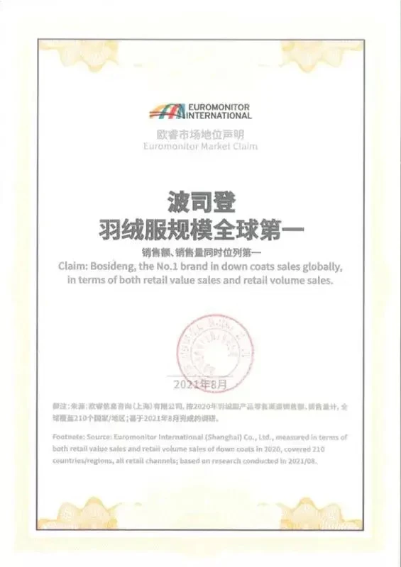 波司登羽绒服规模全球领先欧睿证明