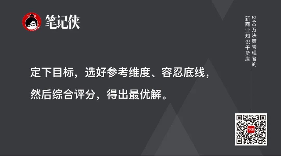 定下目标,选好参考维度、容忍底线,然后综合评分,得出最优解。计算得失得出答案后,不回头,不纠结,向前看。
