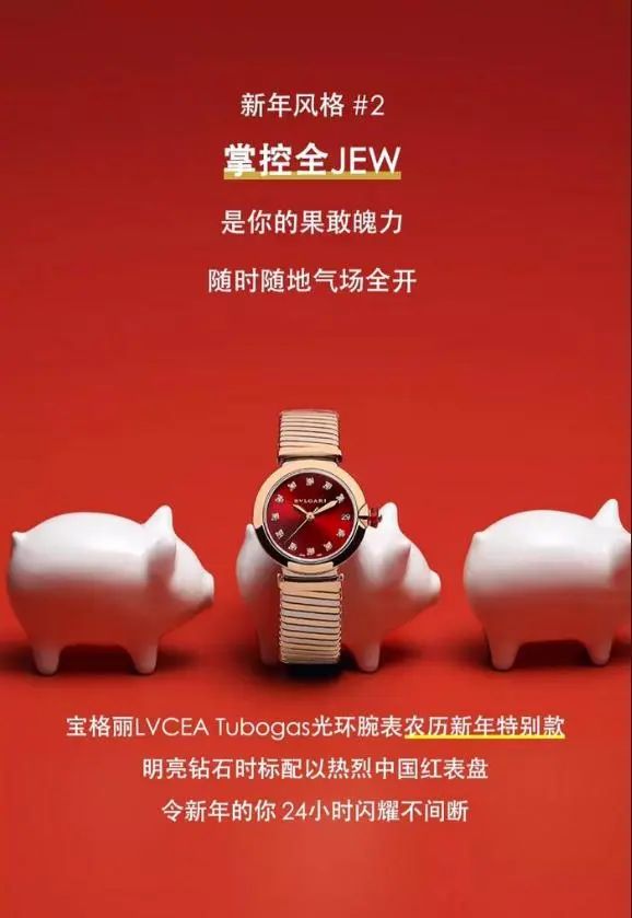 比如2019年宝格丽上线猪年新春广告语中,使用“猪”的谐音单词“Jew”。