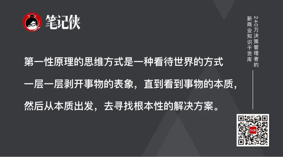 这句话听起来太晦涩,马斯克对这句话做了重新解读:“第一性原理的思维方式是一种看待世界的方式一层一层剥开事物的表象,直到看到事物的本质,然后从本质出发,去寻找根本性的解决方案。”