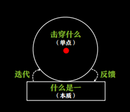 找到“一”以后,如果我们的资源、能力、资金都不够,是不能全面出击的,因此要找一个针尖大小的点,单点击穿。击穿以后还不够,市场在不断发生变化,我们还要通过不断迭代来进化商业模式。