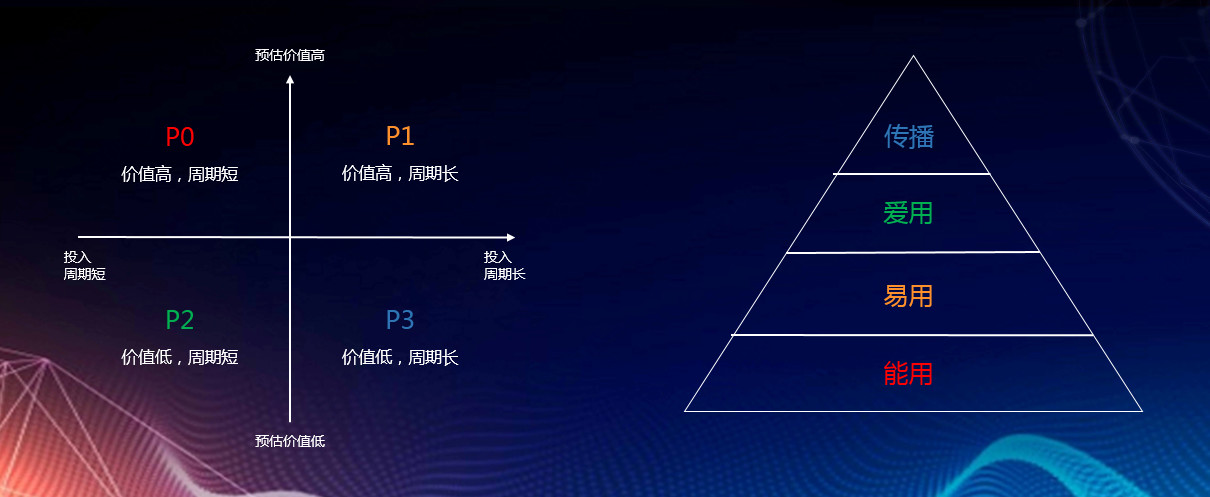 另一种评估需求优先级的方法就是体验金字塔模型,从塔底到塔尖依次是能用、易用、爱用、传播,对应需求优先级由高到低。
