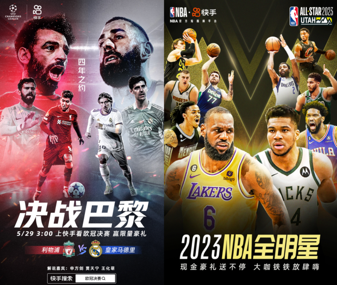 不只是奥运,国内有广泛球迷基础的赛事也是快手的必选项。去年欧冠决赛时,快手打造了竖屏观看的专属入口,集合了诸多足球评论员及主持人组成“解说天团”,也跨垂类联动了多位达人参与欧冠话题讨论。另外平台还准备了签名球衣、红包来激励用户参与二创。自2022-2023NBA赛季开赛以来,快手也围绕赛事打造了多样化内容矩阵,包括赛事内容、原创节目、球星直播、特色二创短视频、多类型互动玩法等等。