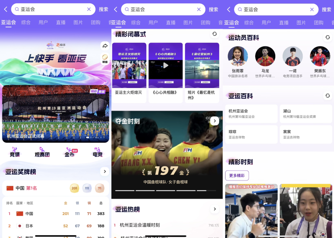 要形成一个高热话题源源不断输出的氛围、成为影响全网的赛事内容传播者,仅有场域基础远远不够。这段时间长短视频、资讯新闻、社交内容平台上都有亚运会相关话题,如此对比之下,快手在体育赛事内容运营上的独到之处也就显现了出来。