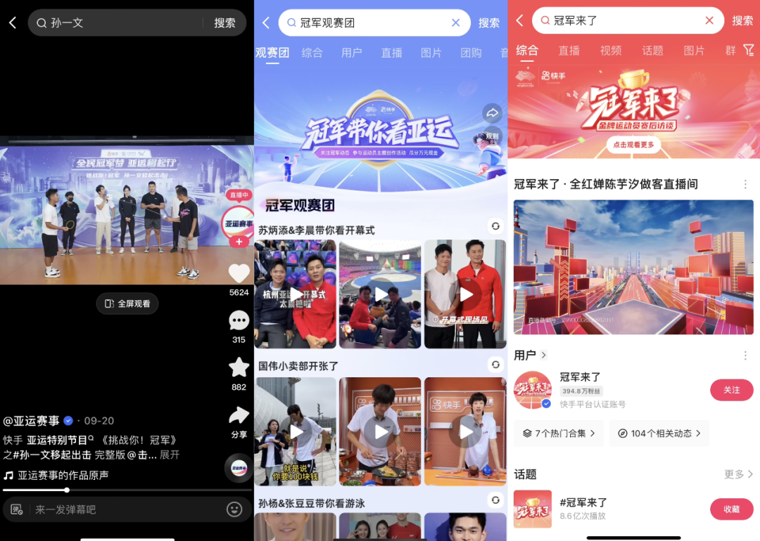 《挑战你!冠军》《冠军观赛团》《冠军来了》多档自制节目的轮番上阵,有效强化了用户的赛事沉浸感,而这也正是快手能够产生不少新热点、新话题的关键所在。比如今年屡次登上热搜的奥尼尔,就是在快手亚运会栏目《冠军观赛团》直播间与一众用户见面,中国女篮比赛时他还和“全民健身教练”刘畊宏作为节目嘉宾出现在观众席,并和老朋友姚明会面。《冠军来了》每一期节目播出后也都能在各大平台引爆话题讨论,#汪顺说叶诗文非常不容易#、#全红婵画了自己最喜欢的小乌龟#等话题的热度都相当高。