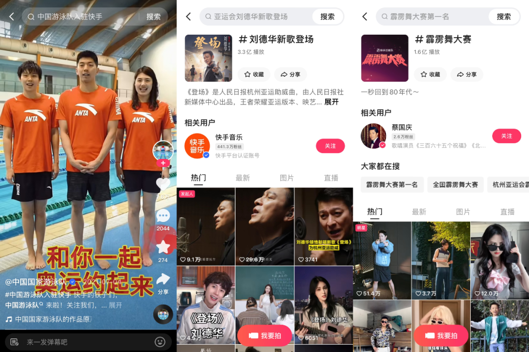 比如有众多运动员组成了“快手运动员天团”,喊话大家来快手看亚运;成龙、蔡依林、黄晓明等明星纷纷发布视频为快手亚运期间的精彩活动预热;站内还有#霹雳舞大赛 挑战活动,邀请蔡国庆和近百位头部达人参与为亚运加油,目前该话题已斩获1.6亿播放量。此外还有全民翻唱人民日报杭州亚运助威曲《登场》。
