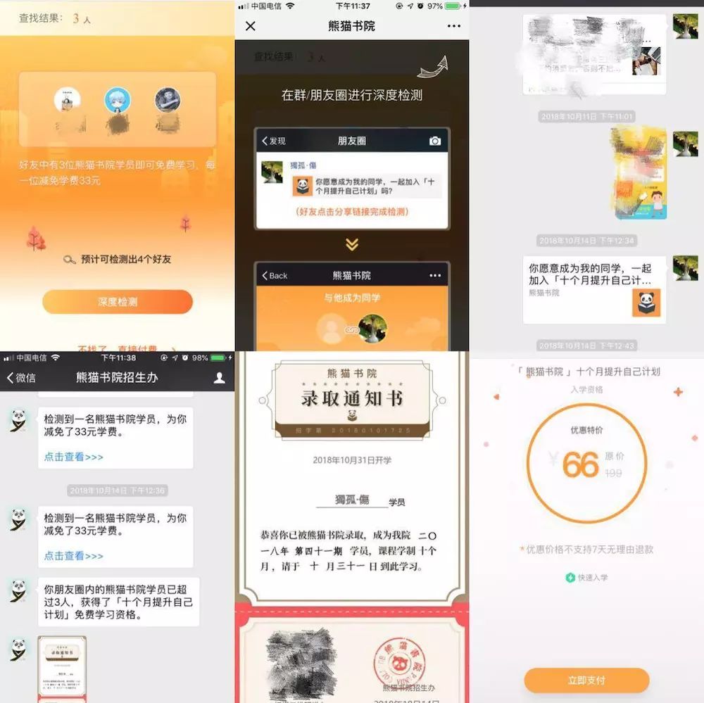 熊猫书院采用了这个玩法,其基本路径是:用户发邀请链接--好友点击--双方经检测成为同学--均获得一定额度优惠--邀请一定数量好友通过检测成为同学即可免费报名--继续邀请直到完成任务--裂变循环。