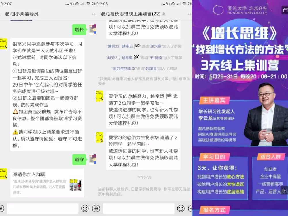 关于微信群助力的案例,其实笔者见过的不多,混沌大学最近以3人拼团的名义使用了这一玩法,笔者认为体验不是很好,太容易被截流,另外用户完成邀请获得奖励,就可以退群,留存性不好,建议谨慎使用。