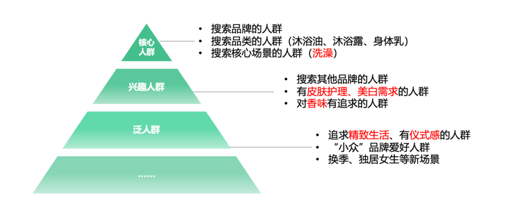 我们可以关注那些曾搜索过品牌名称的用户,以及搜索过沐浴油、沐浴露、身体乳等相关产品的用户。这些用户表明了对相关产品的明确兴趣。