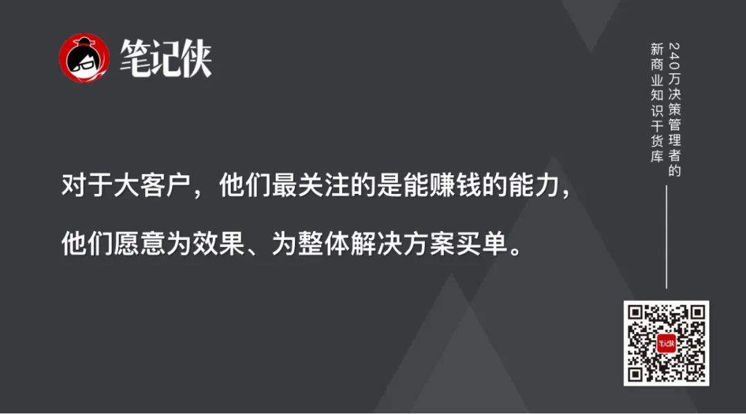 其实对于大客户,他们最关注的是能赚钱的能力,他们愿意为效果、为整体解决方案买单。而不是为功能或者厂家品牌买单。