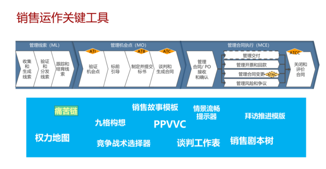 所以,华为把销售工具嵌入到流程里面去了,就深刻体现了这一点。每个销售如果想顺畅地往下推动项目,就必须得过这个流程中的关键点,那你就得用相应的工具,所以,大家不知不觉就养成这么一个良好的销售习惯。