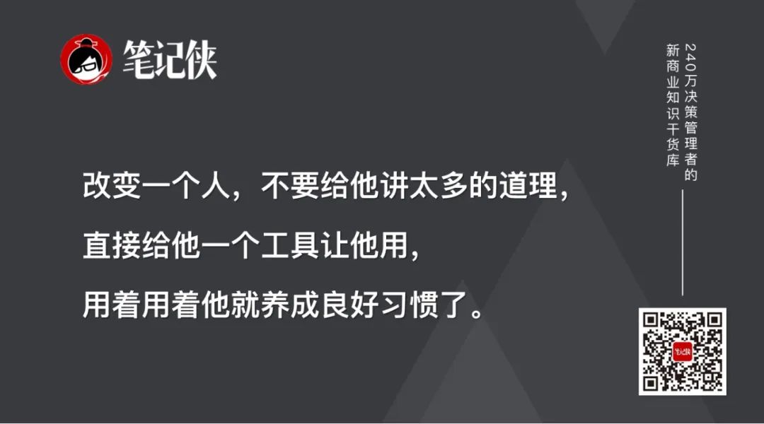 我记得《第五项修炼》的作者,彼得圣洁,曾经说过一句话:改变一个人,不要给他讲太多的道理,直接给他一个工具让他用,用着用着他就养成良好习惯了。