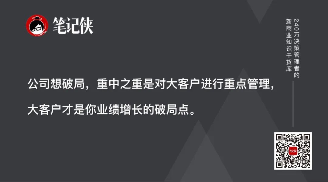 公司想破局,重中之重是对大客户进行重点管理,大客户才是你业绩增长的破局点。它不是一个简单的管理决策,因为大客户有大需求、大支付、大复购,是公司的核心命脉所在。