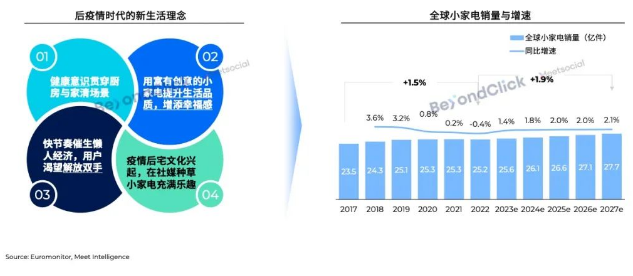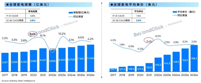 ①前两年,在疫情常态化下,健康卫生、宅经济等新生活方式利好家电赛道,居家时间延长推高消费者对家电需求,全球家电增速在后疫情迎来小高峰。