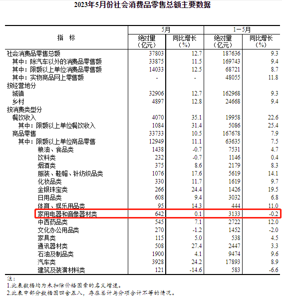 ④据国家统计局数据,今年1-5 月家用电器和音像器材类社零总额同比-0.2%,弱于整体社零增速,有待消费信心提升。