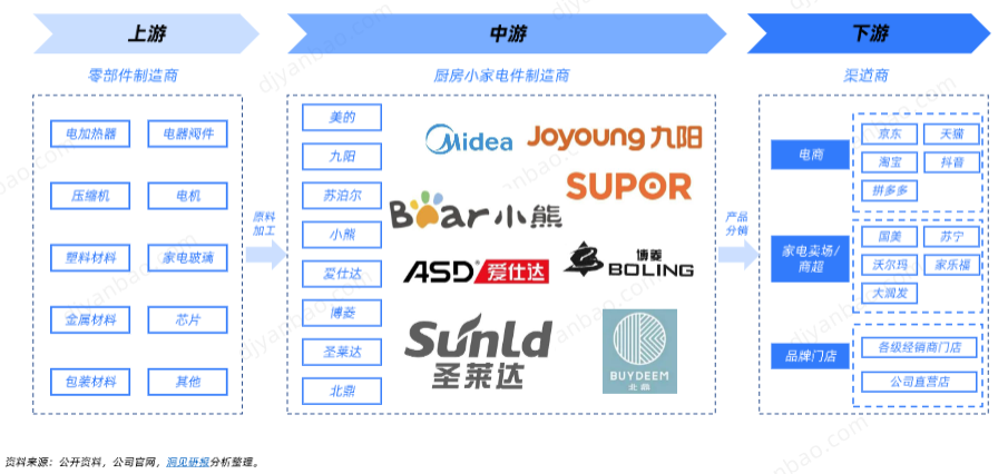 3、在产业链图谱,九阳处于产业中下游小家电制造商,通过整合下游渠道进行售卖。