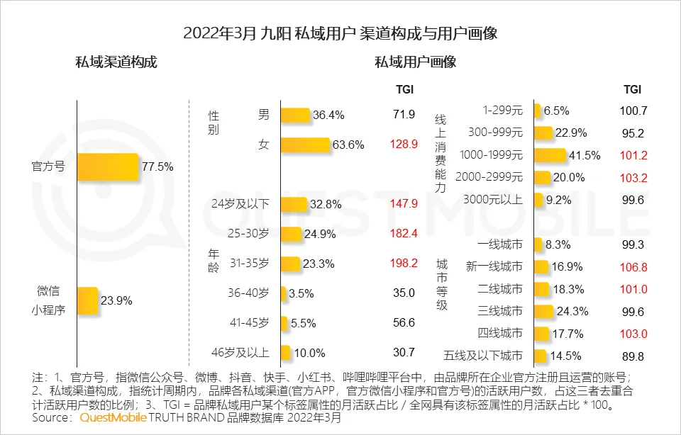 3、私域运营以官方号为主,并协同多个微信小程序实现多场景服务。用户中年轻女性居多,消费能力中等偏上,城市等级分布较均衡。