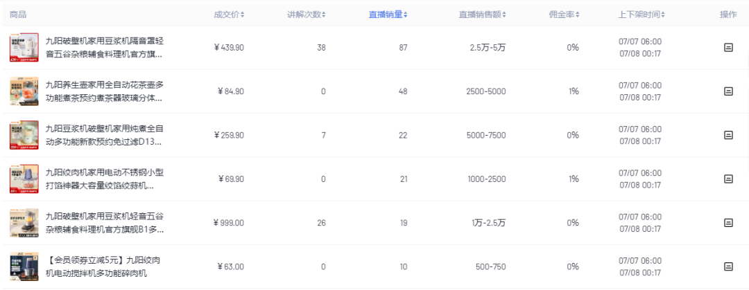 ⑤以2023年7月7日当天直播数据为例可知,销售额超1w的均为两个主推款。此外,以同类低价豆浆机、绞肉机、养生壶销量比较可观。