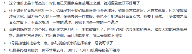 整体来说直播间以单调的讲解爆款产品为主要基调,话术中除部分使用场景氛围感营造外,基本围绕着产品卖点、产品信息进行讲解,缺乏购买欲望,购买产品理由多为其性价比高,价格比其他地方低。
