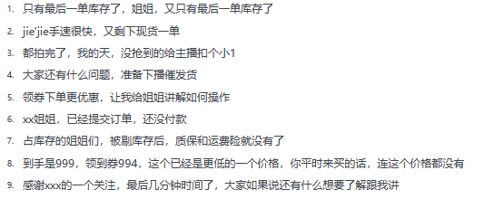 主播虽能够熟练讲解主推品的产品卖点以及氛围感营造,但当用户问到不熟悉产品时,主播的讲解基本在1-2句后直接引导下单,这让用户没有购买欲望。