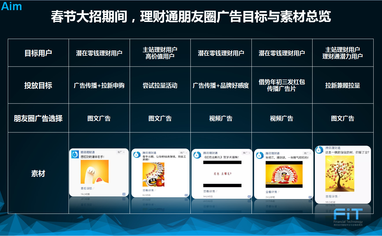 最后,强烈建议需要投朋友圈广告的各位,根据AIM的要点,踏实做好规划。下面是理财通春节期间的素材总览表: