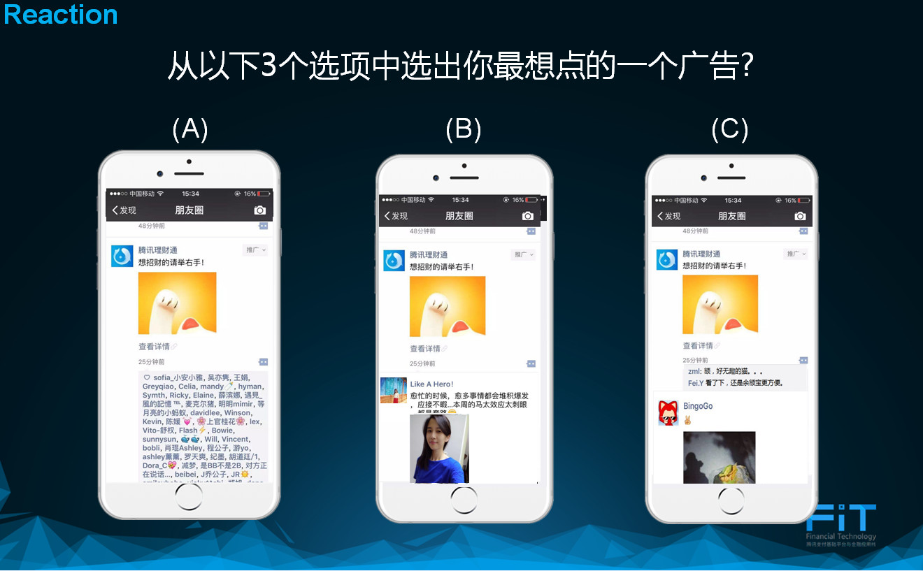 经过2次课堂现场提问,几乎所有的的同学都会选择(A)。事实上,A选项是去年10月理财通投的第一支朋友圈广告,获得了不错的点击,排名当时9个金融客户第2。 虽然B选项颜色很鲜艳,但是直接的广告语很难获得用户的好感。用户实际使用过程中,还没仔细体会“微信理财 你就理财通”的意思就已经很快刷过了。