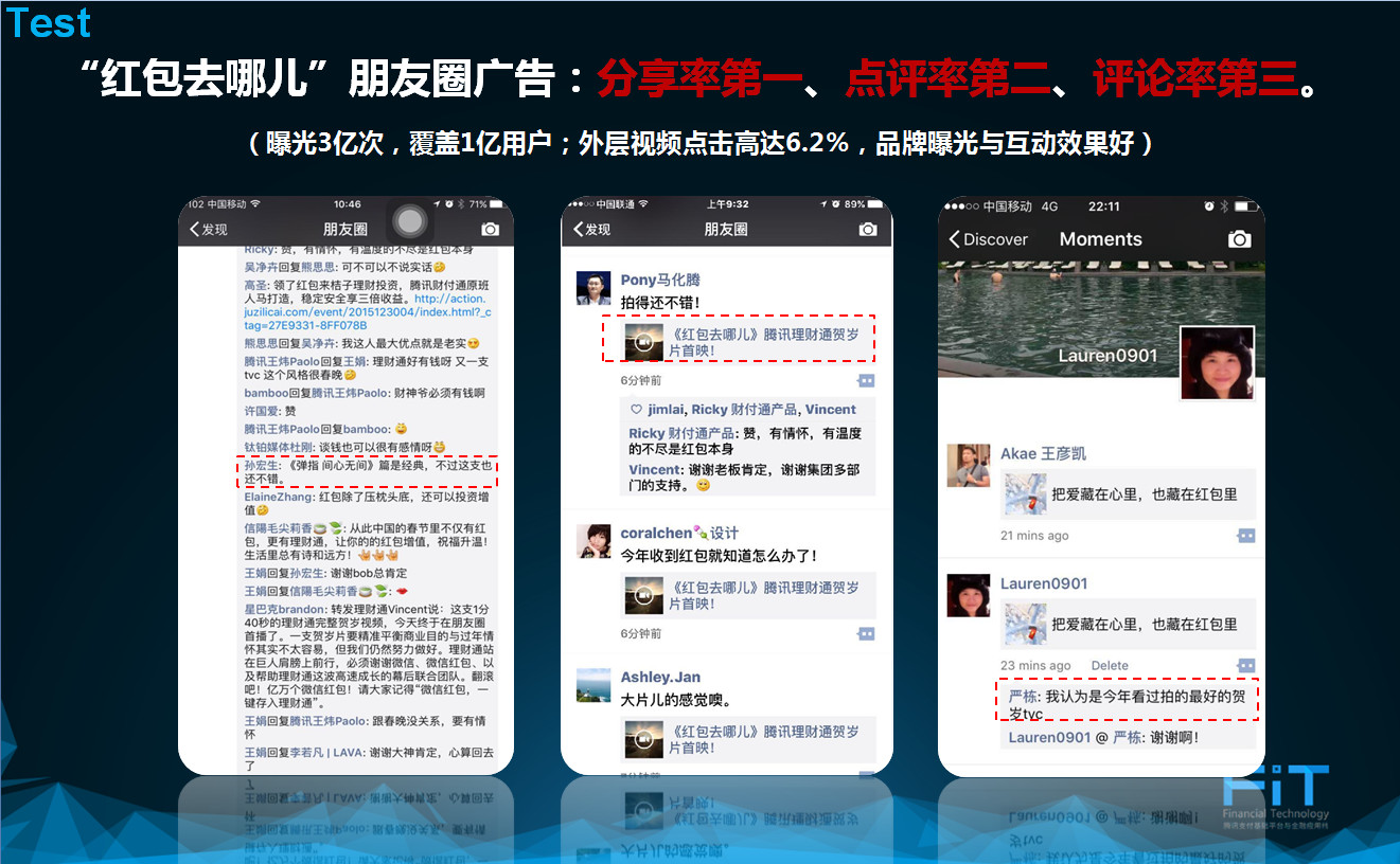 - Amplification:2月1日朋友圈广告上映的同时,除了朋友圈广告本身具有3亿曝光量和1亿用户覆盖外。联合腾讯视频,在腾讯视频上同步播放红包去哪儿广告15秒预热视频,每天1亿次曝光。同时在所有视频网站均上传“红包去哪儿”视频,获得2000万播放量。