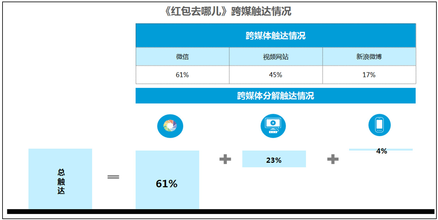 从实际的媒介投放看,红包去哪儿这支片仅在朋友圈广告进行投放,没有在其他任何渠道进行投放。但从尼尔森提供的广告后测结果上看,视频网站与微博起到了很好的补充作用。有45%看过“红包去哪儿”广告的用户从视频网站上看到,有17%看过“红包去哪儿”广告的用户从新浪微博中看到。同时,去重后发现视频网站与新浪微博独占27%的贡献,而单一微信(包括朋友圈广告与微信公众号、H5等)占61%的贡献。足可见以朋友圈广告为支点,延长传播周期在扩大传播影响力上是有效的。