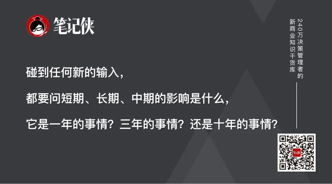 我碰到任何新的输入,我都会问短期、长期、中期的影响是什么,它是一年的事情?三年的事情?还是十年的事情?所以,你要随时想到这件事情短期、中期、长期,是一个什么样的取舍。