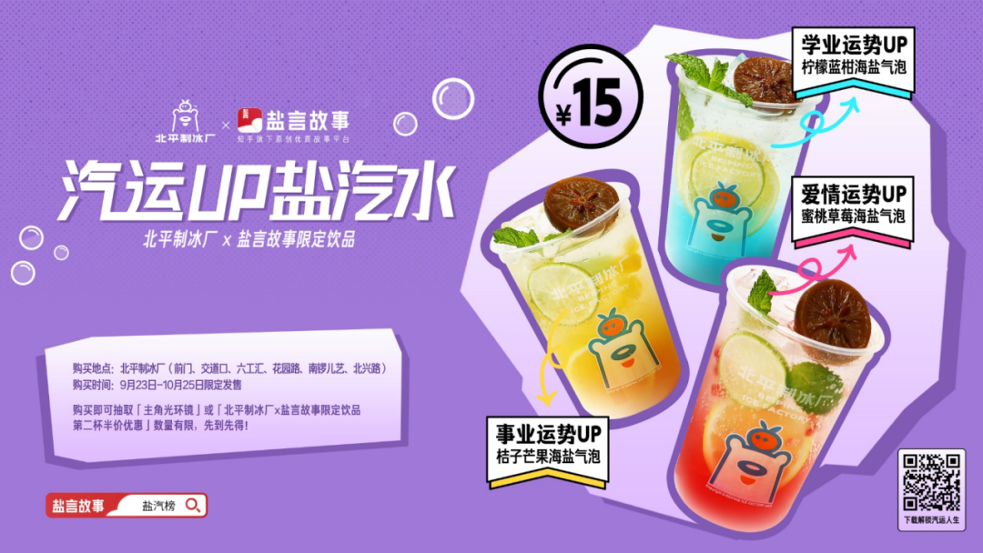 不仅如此,北京线下7家门店同步售卖联名盐汽水,5家门店同步抽奖互动活动:“主角光环境”、“汽运 UP 手串”、“北平制冰厂周边”、“知乎盐言故事会员月卡”。